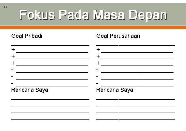 91 Fokus Pada Kekuatan Anda Kekuatan / Kelebihan Saya Kelemahan / Kekurangan Saya 1. __________________ ___ 2. ____________________ _ 3. ____________________ _ 4. ___________________ __ 5. ____________________ _ 6. __________ _ Mulai saat ini FOKUS HIDUP SAYA harus kepada : 6. __________ _ akan menjadi BONSAI KEKUATAN saya kalau tidak maka saya 7. __________