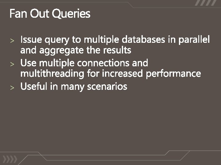 >>FUTURE Better tooling for developers and administrators: o Dynamic database partition splits o Ability to merge database partitions o Improved schema management across database partitions Database Features for scale-out application patterns: o Connection management o Fan-out query support
