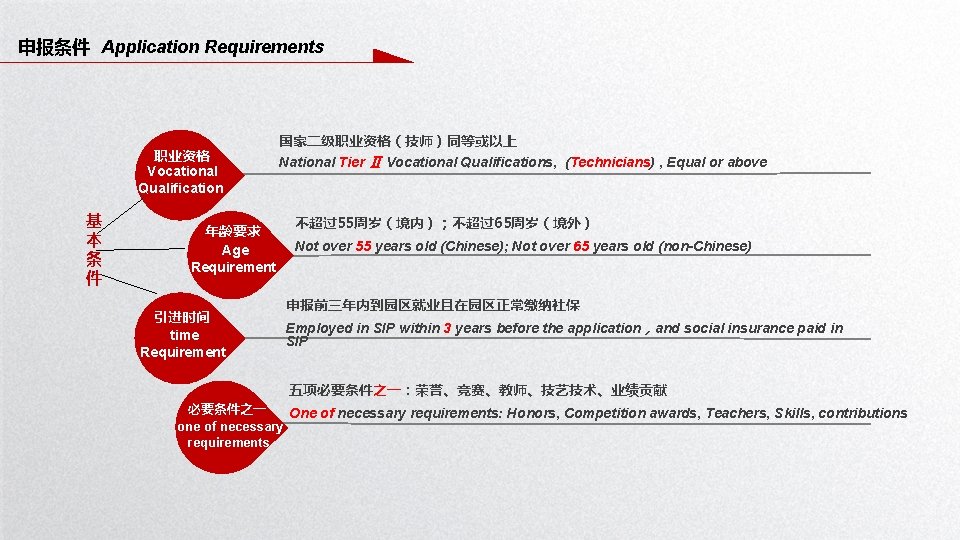申报条件 Application Requirements 职业资格 Vocational Qualification 基 本 条 件 年龄要求 Age Requirement 引进时间 time Requirement 国家二级职业资格(技师)同等或以上 National Tier Ⅱ Vocational Qualifications, (Technicians) , Equal or above 不超过55周岁(境内);不超过65周岁(境外) Not over 55 years old (Chinese); Not over 65 years old (non-Chinese) 申报前三年内到园区就业且在园区正常缴纳社保 Employed in SIP within 3 years before the application,and social insurance paid in SIP 五项必要条件之一:荣誉、竞赛、教师、技艺技术、业绩贡献 必要条件之一 One of necessary requirements: Honors, Competition awards, Teachers, Skills, contributions one of necessary requirements