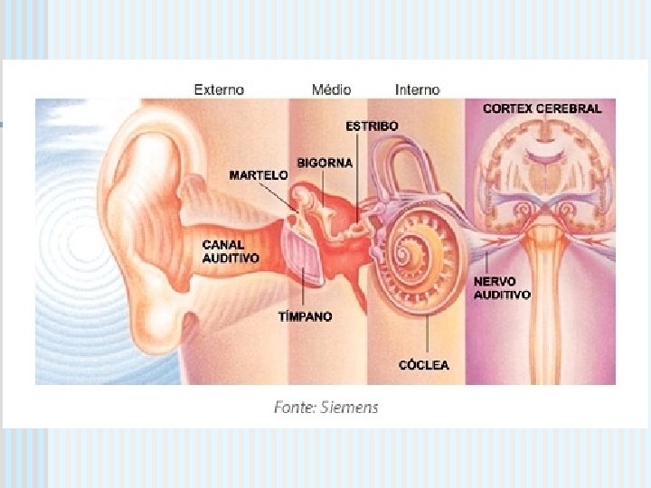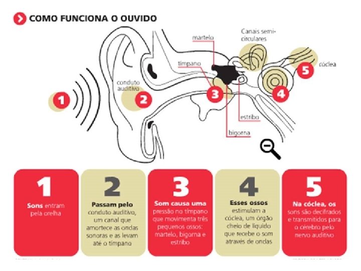 n 1 – Sons entram pela orelha. 2 – Passam pelo conduto auditivo, um canal que amortece as ondas sonoras e as levam até o tímpano. n 3 – Som causa uma pressão no tímpano, que movimenta três pequenos ossos: martelo, bigorna e estribo. n 4 – Esses ossos estimulam a cóclea, um órgão cheio de líquido que recebe o som através de ondas. n 5 – Na cóclea, os sons são decifrados e transmitidos para o cérebro pelo nervo auditivo. n