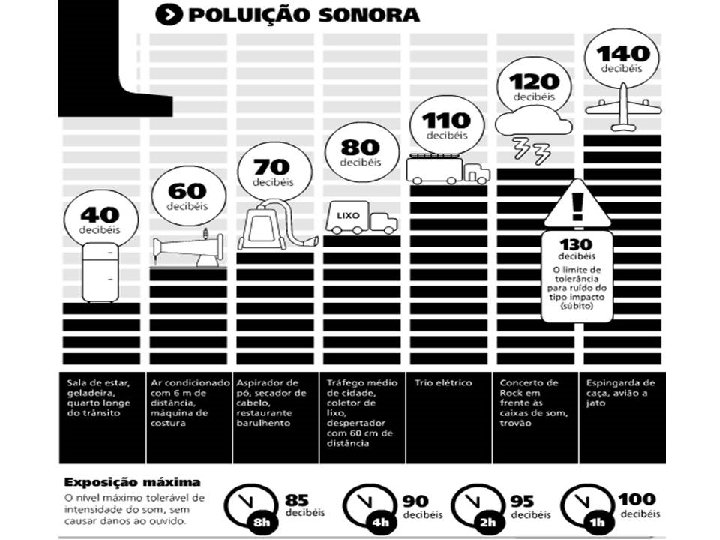 TABELA Níveis de pressão sonora em decibéis(NPS) e tempo de exposição máxima permitida para ruído contínuo ou intermitente (Norma NHO 01, 1999, FUNDACENTRO) NPS tempo de exposição n 85 8 hs solda elétrica d. B 4 hs usinagem peças 91 d. B 2 hs tupias e prensas n 94 1 hs serra circular n 88 n d. B n 97 n 100 d. B n 115 d. B* Locais/ equipamentos d. B 30 min 15 min 28 seg caldeiraria jato de areia, ar comprimido martelete pneumático