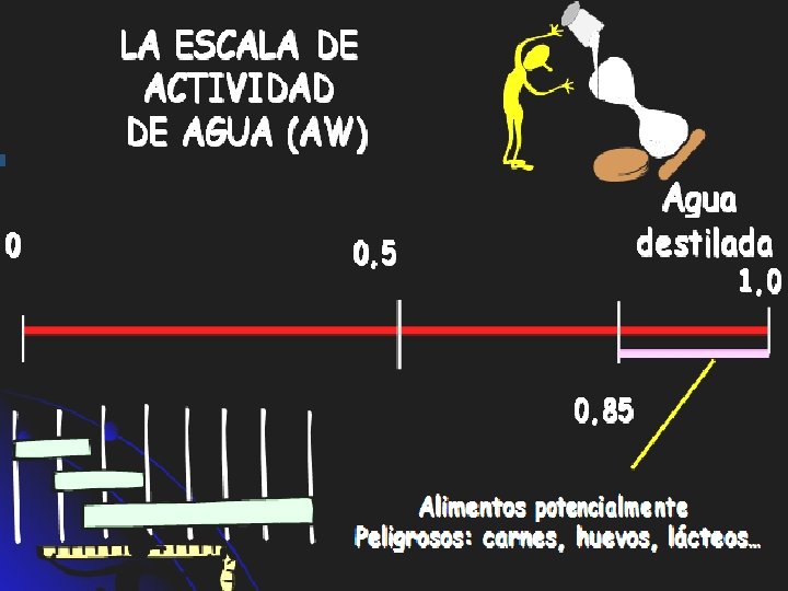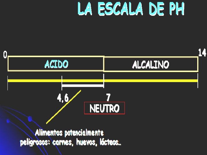 El valor de p. H igual o inferior a 4, 5 es un punto de control crítico (PCC) en el procesado térmico de alimentos enlatados para inhibir el crecimiento de Clostridium botulinum. A p. H inferiores a 4, 2 se controlan casi todos los microorganismos que producen intoxicaciones alimentarias, pero algunas levaduras, hongos y bacterias acidolácticas se desarrollan bien a p. H inferiores a éste. El p. H es un símbolo que indica si una sustancia es ácida, neutra o básica, un factor que controla la regulación de muchas reacciones químicas, bioquímicas y microbiológicas. La escala de p. H es de 0 a 14. La disolución neutra, tiene un p. H de 7, valores menores de 7 indican una disolución acida y valores superiores a 7 indican una disolución alcalina.