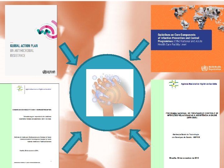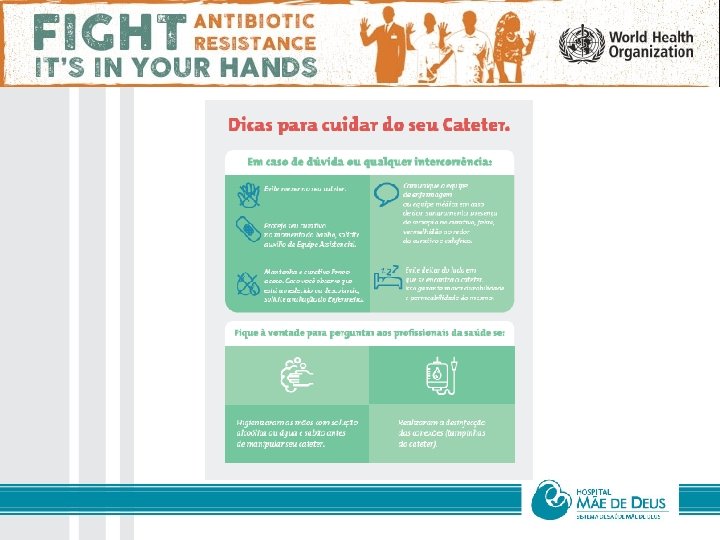 Objetivos: • Que os profissionais de saúde higienizem as mãos nos momentos adequados • Que os gestores que apoiem e deem suporte para a implantação do programa de controle de infecção • Que os responsáveis pelo PCI liderem campanhas de higiene das mãos • Que os gestores públicos demonstrem apoio e compromisso com assunto em nível nacional Todos objetivos convergindo para redução na resistência bacteriana!