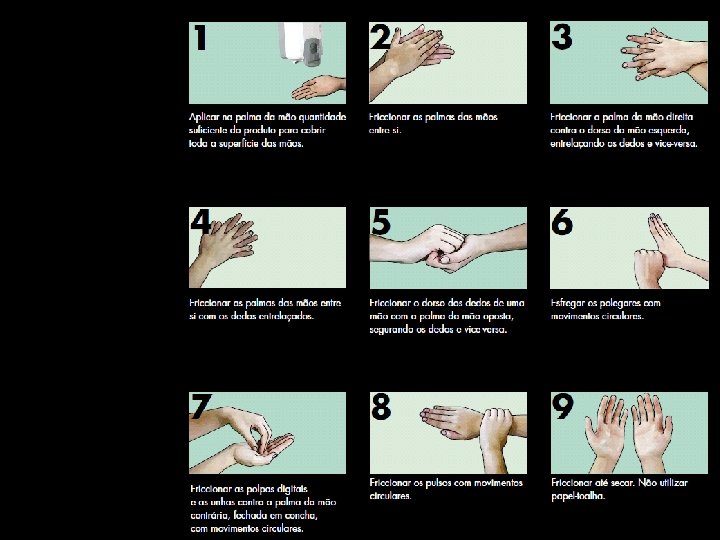 Higiene das mãos § Higiene simples das mãos § Higiene antisséptica das mãos § Clorexidina Triclosan § Fricção antisséptica das mãos § Antissepsia cirúrgica das mãos § Escovas com clorexidina Solução alcoólica Fonte: ANVISA