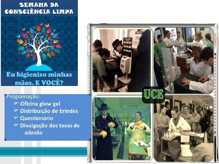 ◦ Campanhas visuais de estímulo à prática de higiene de mãos, com foco em: Educação: para suprir falhas de conhecimento sobre o assunto Sinalização: para lembrar os profissionais que ainda não incorporaram o hábito