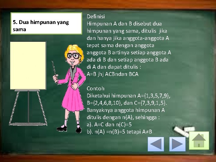 5. Dua himpunan yang sama Definisi Himpunan A dan B disebut dua himpunan yang sama, ditulis jika dan hanya jika anggota-anggota A tepat sama dengan anggota B artinya setiap anggota A ada di B dan setiap anggota B ada di A dan dapat ditulis : A=B jhj ACBndan BCA Contoh Diketahui himpunan A={1, 3, 5, 7, 9}, B={2, 4, 6, 8, 10}, dan C={7, 3, 9, 1, 5}. Banyaknya anggota himpunan A ditulis dengan n(A), sehingga : a). A=C dan n(C)=5 b). n(A) =n(B)=5 tetapi A≠B