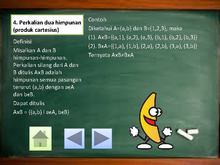4. Perkalian dua himpunan (produk cartesius) Definisi Misalkan A dan B himpunan-himpunan. Perkalian silang dari A dan B ditulis Ax. B adalah himpunan semua pasangan terurut (a, b) dengan aϵA dan bϵB. Dapat ditulis Ax. B = {(a, b) I aϵA, bϵB} Contoh Diketahui A={a, b} dan B={1, 2, 3}, maka (1). Ax. B={(a, 1), (a, 2), (a, 3), (b, 1), (b, 2), (b, 3)} (2). Bx. A={(1, a), (1, b), (2, a), (2, b), (3, a), (3, b)} Ternyata Ax. B≠Bx. A