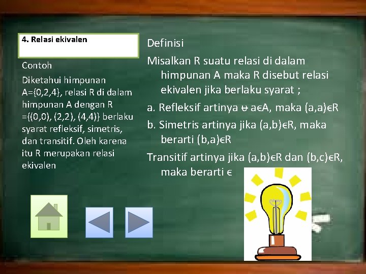 4. Relasi ekivalen Definisi Misalkan R suatu relasi di dalam Contoh himpunan A maka R disebut relasi Diketahui himpunan ekivalen jika berlaku syarat ; A={0, 2, 4}, relasi R di dalam himpunan A dengan R a. Refleksif artinya ᵿ aϵA, maka (a, a)ϵR ={(0, 0), (2, 2), (4, 4)} berlaku b. Simetris artinya jika (a, b)ϵR, maka syarat refleksif, simetris, berarti (b, a)ϵR dan transitif. Oleh karena itu R merupakan relasi Transitif artinya jika (a, b)ϵR dan (b, c)ϵR, ekivalen maka berarti ϵ