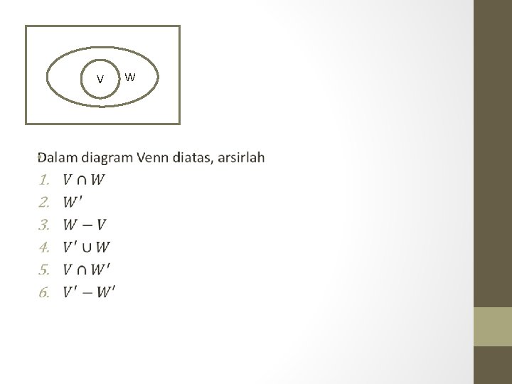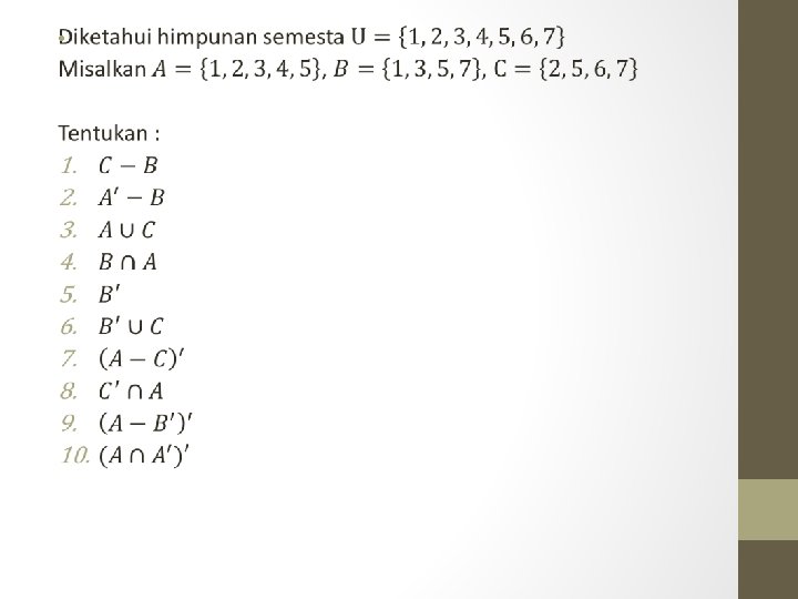 • Dari 36 siswa kelas 7 SMP, 20 siswa gemar IPA, 15 siswa gemar IPS dan 8 siswa tidak gemar IPA maupun IPS. Hitunglah banyaknya siswa dari kelas tersebut yang gemar keduanya. • Dari sekelompok siswa didapat data sebagai berikut : 85 siswa gemar Volly, 63 siswa gemar Basket, 48 gemar Volly maupun basket. Hitunglah banyaknya siswa dalam kelompok tersebut. • Di kelas 1 IC berjumlah 35 orang. Setelah didata, 21 orang menyukai pelajaran Matematika, 20 orang menyukai pelajaran Biologi, dan 10 orang menyukai kedua-duanya. Hitunglah banyaknya orang yang tidak menyukai kedua-duanya. • Dari 35 anak, terdapat (25 – x) anak gemar makan permen dan (18 – x) gemar makan coklat. Jika 7 anak tidak gemar makan permen dan coklat. Hitunglah banyaknya anak yang gemar makan coklat saja.
