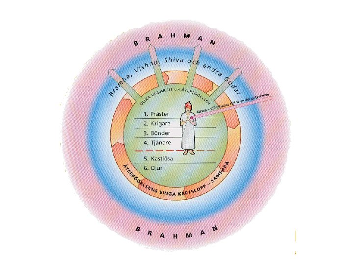 Kasterna – en gudomlig ordning? • Människor i Indien blev tidigt indelade i fyra klasser eller kaster. • - präster, kallas brahmaner, ”de som är hängivna Brahman”, Världssjälen • - krigare och ämbetsmän • - bönder, köpmän och hantverkare • - tjänare och slavar • men även kastlösa, utstötta, prostituerade