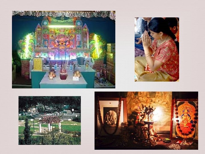 Tempel Många hinduer har ett altare hemma där man offrar till sin gud. Det är även vanligt med små altare i gathörn eller längs vägar där man kan stanna till för att be till gudarna när man känner för det. Att offra innebär att man ger gåvor till guden. Hinduer offrar ofta blommor, rökelse och lite mat som ställs framför guden.