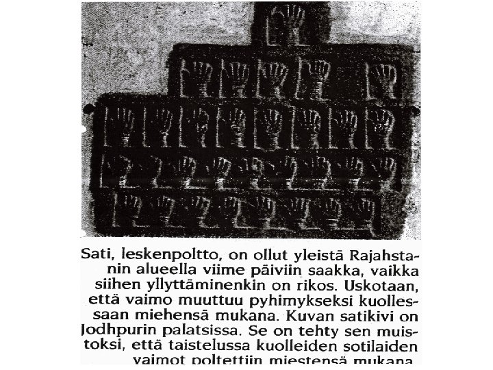 Polttohautaus Gangesilla • Ruumis on arvoton, vain harhaa (Maya), sielu jatkaa uuteen elämään. • Kuolleen omaiset joutuvat rituaalisen saastumisen tilaan • Polttohautaus roviolla joen rannalla • Vainajan poika suorittaa erityiset rituaalit • Vainajan tuhka heitetään pyhään jokeen