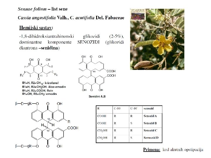 Farmakološko delovanje i primena Aktivni su redukovani oblici aglikona, 1, 8 -dihidroksiantroni. Oni regulišu promet metabolita kroz zid creva; dolazi do zadržavanja vode u crevima i pojačanog “izvlačenja” iz okolnih tkiva. Dejstvom na nervne završetke, utiču na motilitet i peristaltiku debelog creva. Spoj ova dva efekta manifestuje se laksantnim delovanjem. Antrahinonska jedinjenja imaju antibakterijsko i antivirusno delovanje; droge koje sadrže slobodne antrahinone ili njihove heterozide, koriste se kao antiseptici i keratoplastici u dermatološkim preparatima. U laboratorijskim uslovima je potvrđena mutagena aktivnost i citotoksičnost ovih jedinjenja, potencijalnu mogućnost antitumornog delovanja. Tehnička primena: za bojenje tkanina!