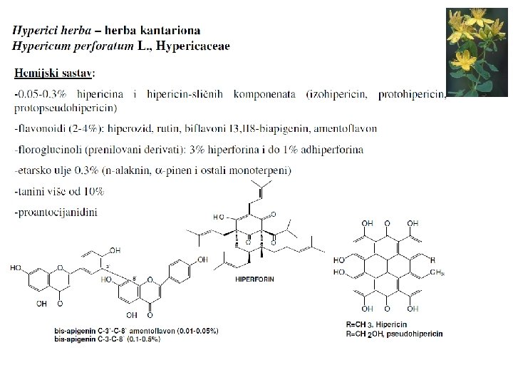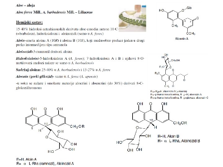 Fizičko-hemijske osobine Aglikoni se rastvaraju u organskim rastvaračima, heterozidi u vodi i alkoholima. Redukovani oblici aglikona su žuto obojeni; antrahinoni su žute ili narandžaste boje; slično je i sa heterozidima. Apsorpcioni spektar s tri maksimuma (220, 280, 430 nm). Aglikoni sublimuju na temperaturi od 200 -220 OC i grade karakteristične kristale. Hemijski se dokazuju Bortregerovom reakcijom; žuti, lipofilni antrahinoni s bazama grade hidrosolubilne, karmincrvene fenolate. (Bornträger's test for anthraquinone glycosides: 1. Powdered drug + dilute acid + boil for 2 min (hydrolysis of glycosides), filter& cool. 2. Filtrate + organic solvent (benzene, ether or chloroform)+ shake. 3. Organic layer (aglycones) + ammonium hydroxide (10 %) + shake vigorously � immediate rose pink o rcherry redcolor in aqueous layer). Količina ukupnih, oksidovanih, antrahinonskih heterozida se određuje spektrofotometrijski, na osnovu intenziteta boje kompleksa aglikona s natrijumhidroksidom ili magnezijum-acetatom. Danas se za kvalitativnu i kvantitativnu analizu koriste hromatografske tehnike, jer omogućavaju definisanje odnosa u okviru kompleksa metabolita.
