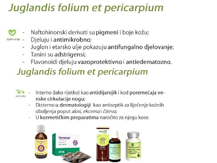 Farmakološko delovanje • Najvažnija je transformacija u hidrohinone i težnja da se povežu s nukleofilnim jezgrom; • Benzohinoni nemaju terapijski značaj. • Naftohinoni su antimikrobni agensi, a sprečavaju i razvoj protozoa. • Zbog nukleofilnih svojstava, izazivaju mutacije i deluju citotoksično; ovakva aktivnost naftohinona još uvek nije adekvatno iskorišćena u terapijske svrhe. • 1, 8 -dihidroksiantrahinoni deluju iritirajuće na glatku muskulaturu, pa se primenjuju kao laksantna sredstva. • Kao polifenoli oni su dobri antiseptici i zato se i koriste u dermatologiji. • 1, 2 (1, 3)- dihidroksiantrahinoni se retko koriste u terapijske svrhe (koristi se za razbijanje oksalatnih naslaga u organima urinarnog trakta).