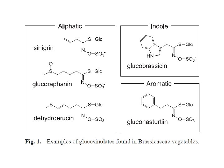 Sumporni heterozidi (Glukozinolati) • Ljuti heterozidi koji u okviru aglikonske komponente sadrže sumpor • Odgovorni su za karakterističnu aromu biljaka familije Brassicaceae, (rotkve, rotkvice, kupus, ren). Ređe se mogu naći u vrstama drugih familija, kao što su Tropeolaceae i Resedaceae