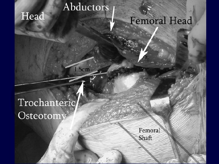 Three Options 1. Detach femoral head from ligamentum teres, repair femoral head fracture with hip dislocated, reduce hip. 2. Reduce hip through posterior incision, close posterior wound, fix femoral head fracture from anterior approach (either now or later). 3. Ganz trochanteric “flip” osteotomy. Best option not known: Damage to blood supply from anterior capsulotomy vs. damage to blood supply from transecting ligamentum teres. These will be discussed in detail in femoral head fracture section.