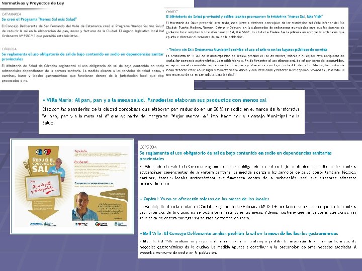 “Para cuidar el corazón, hay que tomar agua baja en sodio” § "La sal del agua no sube la presión" § "En su consumo habitual, el aporte de sodio no parece ser suficiente para provocar enfermedad cardiovascular ni hipertensión" § EL consumo aporta, en promedio, un 10% de los 5, 5 g de sodio que la OMS recomienda ingerir por día. § Un adulto consume unos 11, 2 g diarios de sal; el 75 -80% proviene de los alimentos procesados