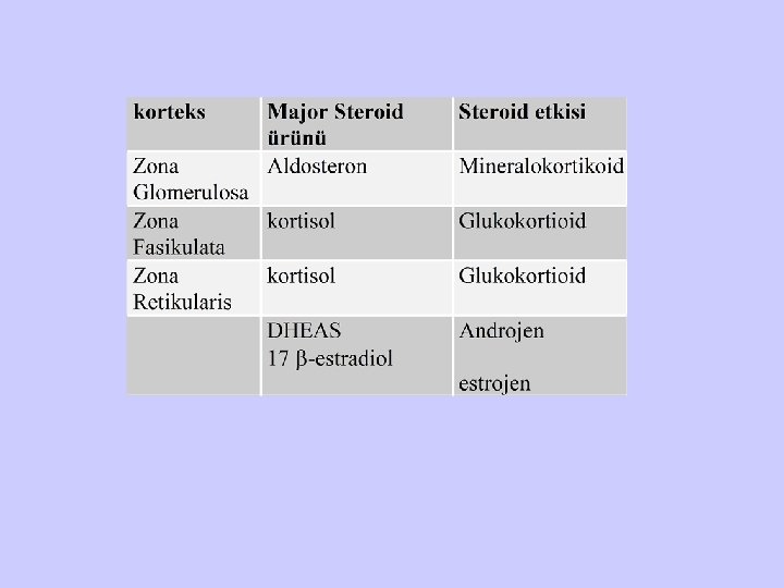 • Glomerulosa’dan aldosteron üretilir. Bu bölgede 17 -alfa hidroksilaz enzimi eksiktir. Bu nedenle kortizol ve androjenler üretilemez. • Fasikülata adrenal korteksin en kalın katmanıdır. Androjen ve kortizol bu bölgede üretilir. • Retikülaris medullanın üstündeki bölgedir. Yine bu bölgede de kortizol ve androjenler üretilir. • Fasikülata ve retikülaris bölgeleri ACTH kontrolü altındadır.