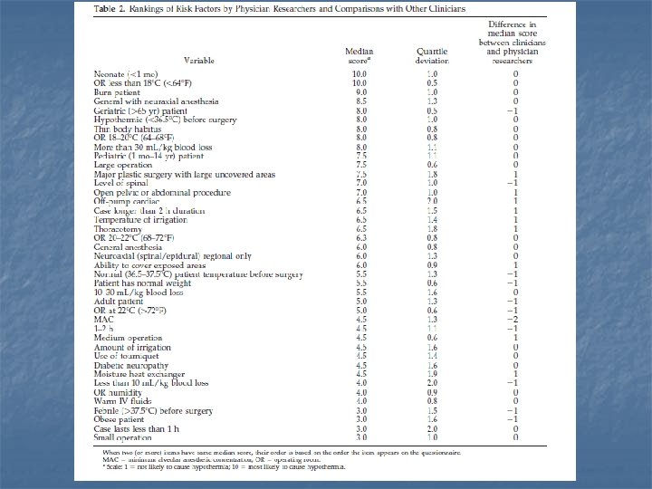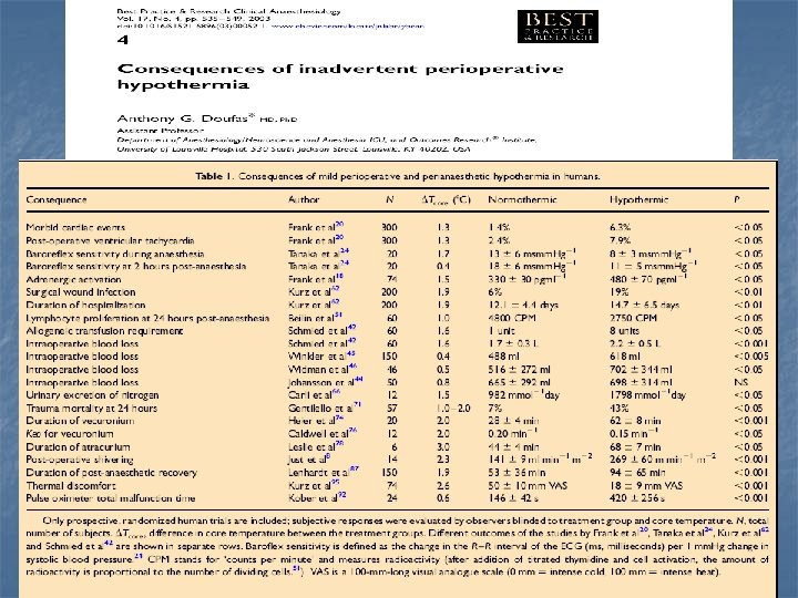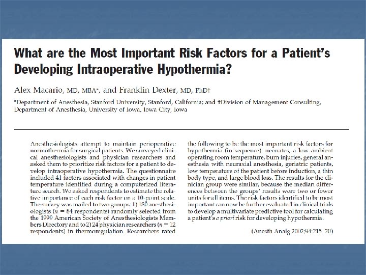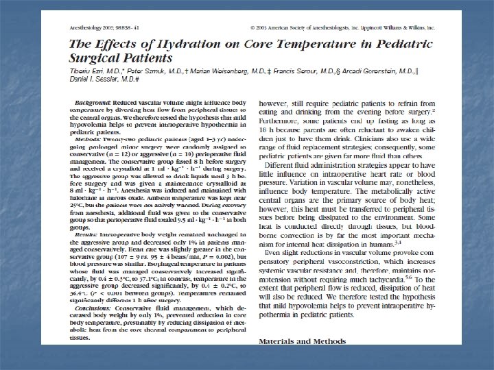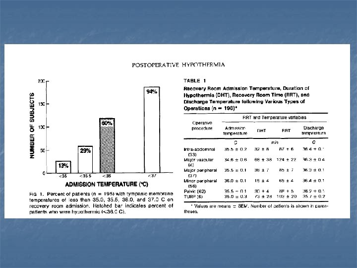 Hipotermia: Causas, riscos e custos Aquecimento pré-operatório T ( C) sem pré-aquecimento com pré-aquecimento Tempo (min) n n Sem pré-aquecimento: T = - 1, 9 0, 3 C Com aquecimento pré-anestésico : T = -1, 1 0, 3 C Daniel I. Sessler, Anesthesiology 2001