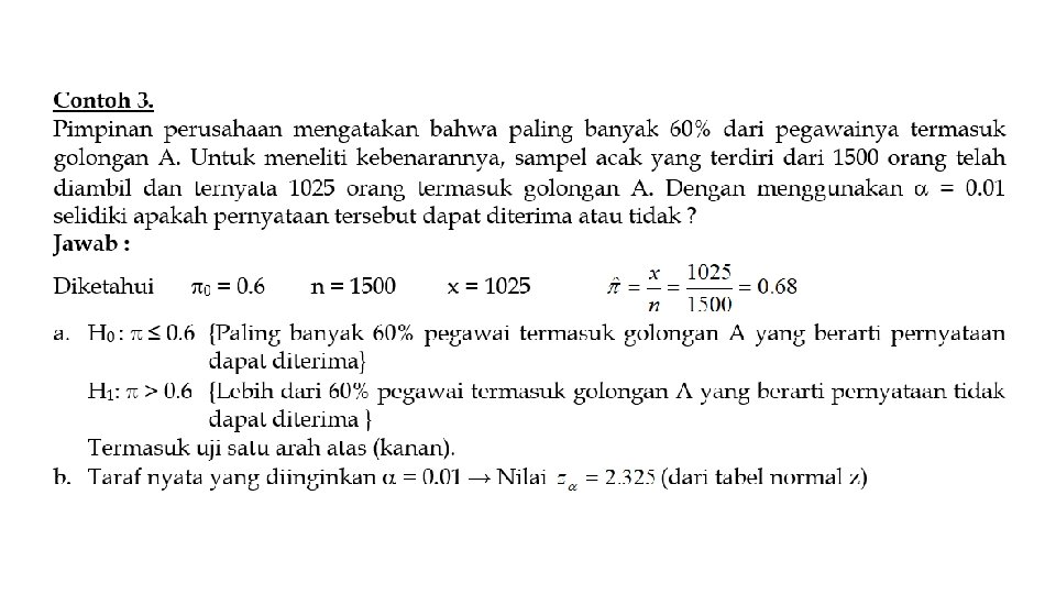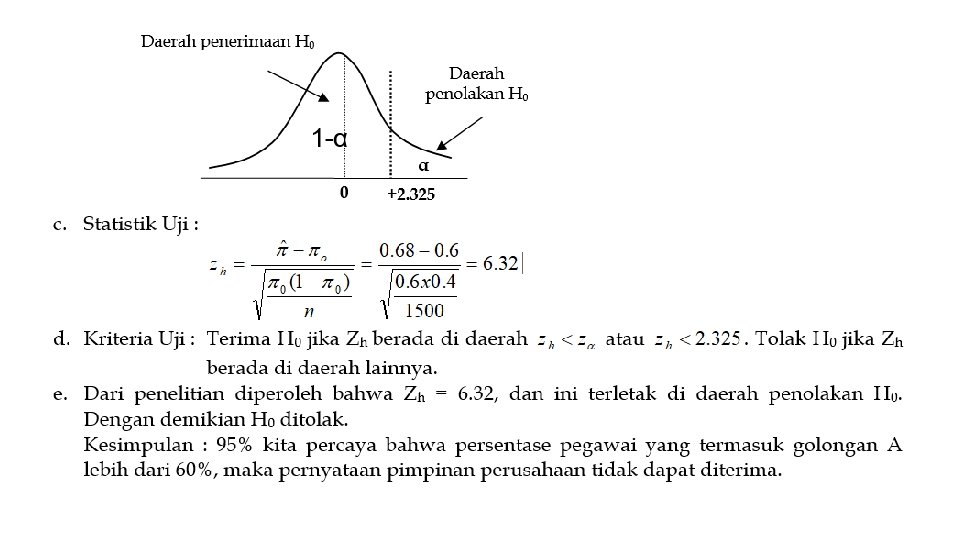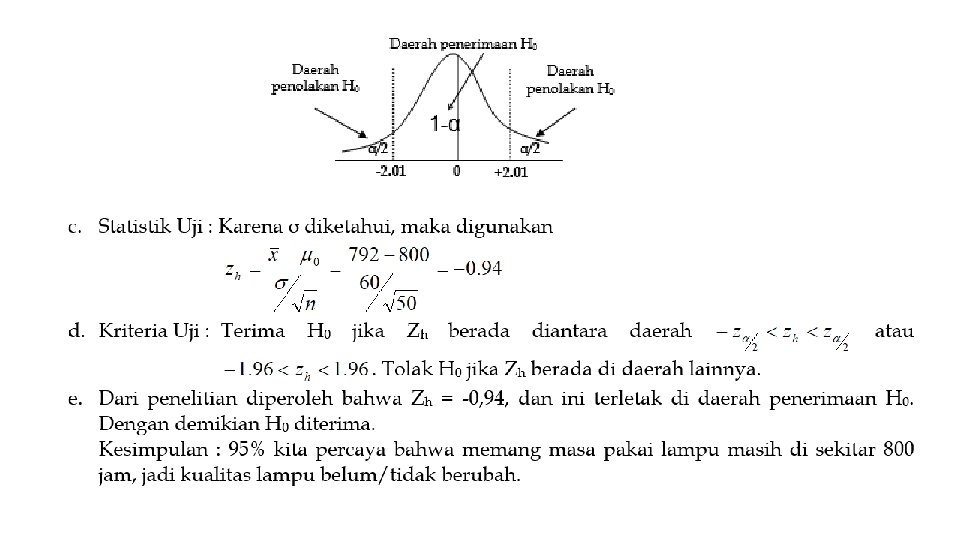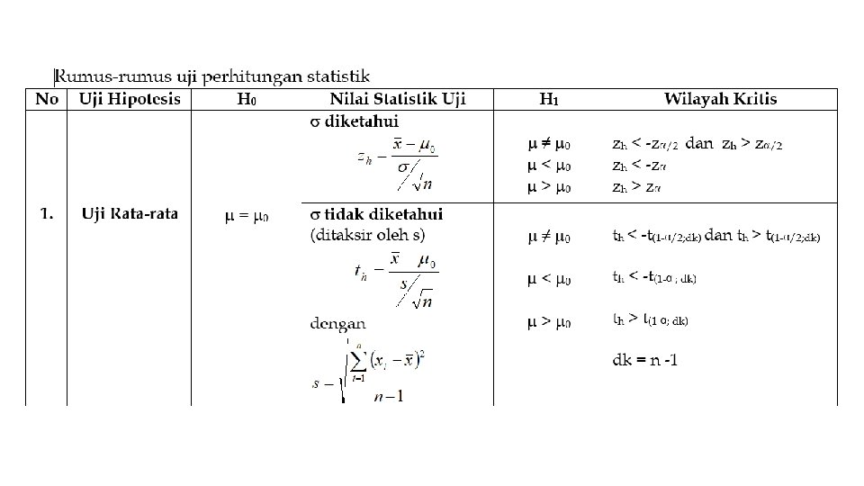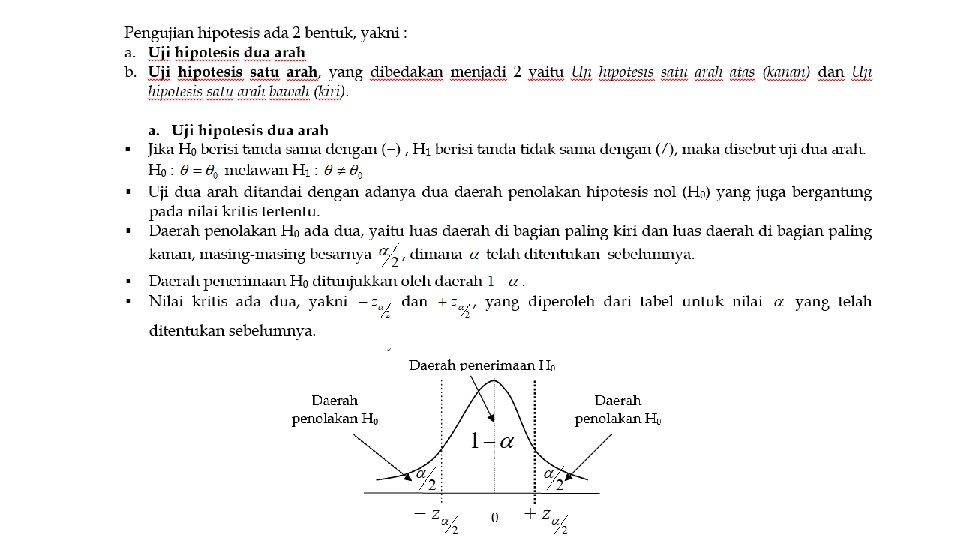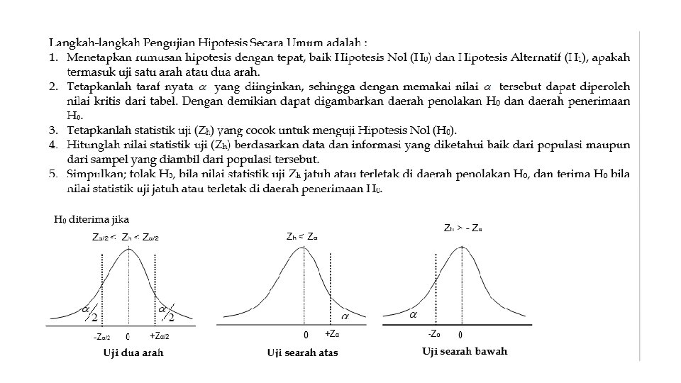 • Teori pengujian hipotesis akan memutuskan apakah H 0 diterima atau ditolak. • Keputusan menolak atau menerima H 0 didasarkan pada uji statistik yang diperoleh dari data sampel, setelah dibandingkan dengan nilai kritis dari distribusi statistik yang bersangkutan yang terdapat dalam tabel yang dibuat statistisi. • Penerimaan suatu hipotesis terjadi karena TIDAK CUKUP BUKTI untuk MENOLAK hipotesis tersebut dan BUKAN karena HIPOTESIS ITU BENAR • Penolakan suatu hipotesis terjadi karena TIDAK CUKUP BUKTI untuk MENERIMA hipotesis tersebut dan BUKAN karena HIPOTESIS ITU SALAH.