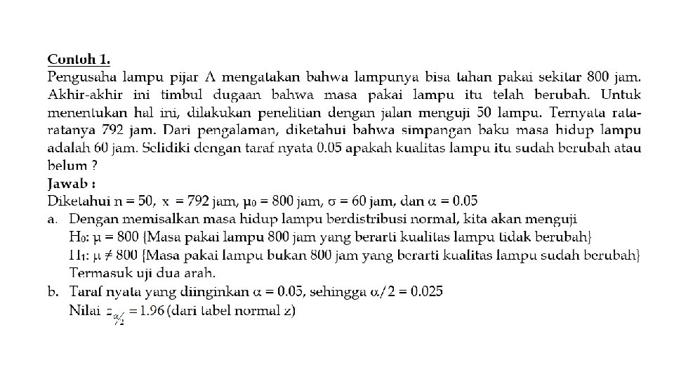 • Setiap hipotesis bisa benar atau salah, sehingga perlu diadakan penelitian sebelum hipotesis itu diterima atau ditolak. • Langkah atau prosedur untuk menentukan apakah menerima atau menolak hipotesis dinamakan pengujian hipotesis. • Pengujian hipotesis adalah suatu cara untuk membuktikan atau menguatkan suatu dugaan atau anggapan tentang parameter populasi yang tidak diketahui, berdasarkan informasi dari sampel yang diambil dari populasi yang bersangkutan, sehingga dari pengujian ini dapat ditarik sebuah kesimpulan. Hipotesis Nol dan Hipotesis Alternatif • Dalam bahasa statistik, apa yang diasumsikan (dihipotesiskan) dinyatakan sebagai Hipotesis Nol (H 0) atau Hipotesis Alternatif (H 1) • Hipotesis Nol (H 0) diuji berhadapan dengan hipotesis tandingannya/lawannya yakni Hipotesis Alternatif (H 1). • Nilai Hipotesis Nol (H 0) ditulis dalam bentuk suatu tanda sama (=, ≥, ≤) dan H 1 sebagai lawannya. • Jika H 0 berisi tanda =, H 1 bisa bertanda ≠ , > atau <. • Jika H 0 berisi tanda ≥, H 1 akan bertanda <. • Jika H 0 berisi tanda ≤, H 1 akan bertanda >.