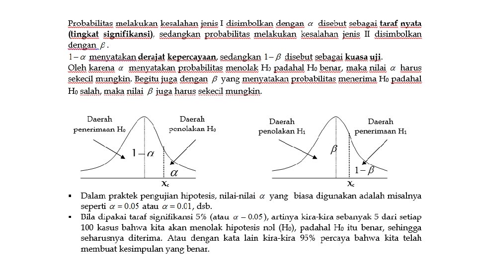 Dua Tipe Kesalahan • Dalam melakukan pengujian hipotesis, ada dua macam kesalahan yang dapat terjadi, dikenal dengan: • Kesalahan jenis I adalah kesalahan akibat menolak Hipotesis Nol (H 0), padahal Hipotesis Nol benar, sehingga sesungguhnya harus diterima. • Dengan kata lain kita menolak hipotesis yang seharusnya diterima. • Kesalahan jenis II adalah kesalahan akibat menerima Hipotesis Nol (H 0), padahal Hipotesis Nol salah, sehingga sesungguhnya harus ditolak. • Dengan kata lain kita menerima hipotesis yang seharusnya ditolak.