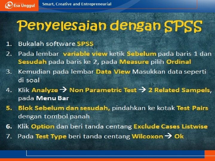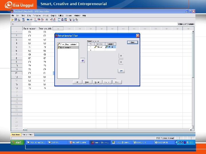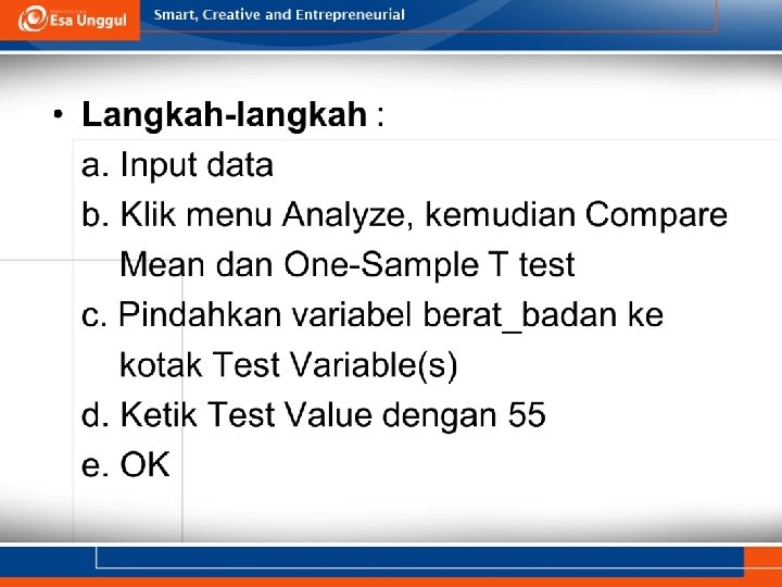 • Langkah-langkah : a. Input data di atas b. Klik menu Analyze, kemudian Compare Means dan Paired-Samples T test c. Masukkan variabel berat_sebelum ke Variable 1 dan berat_sesudah ke Variable 2. d. Klik OK