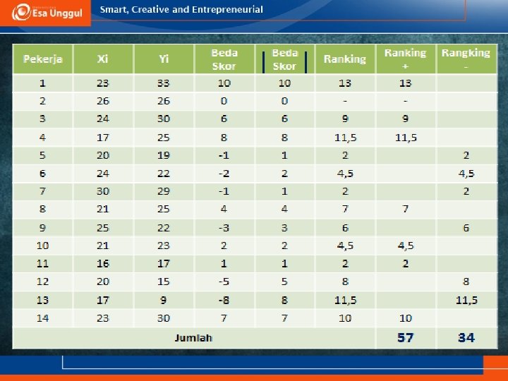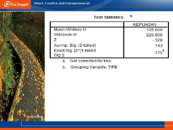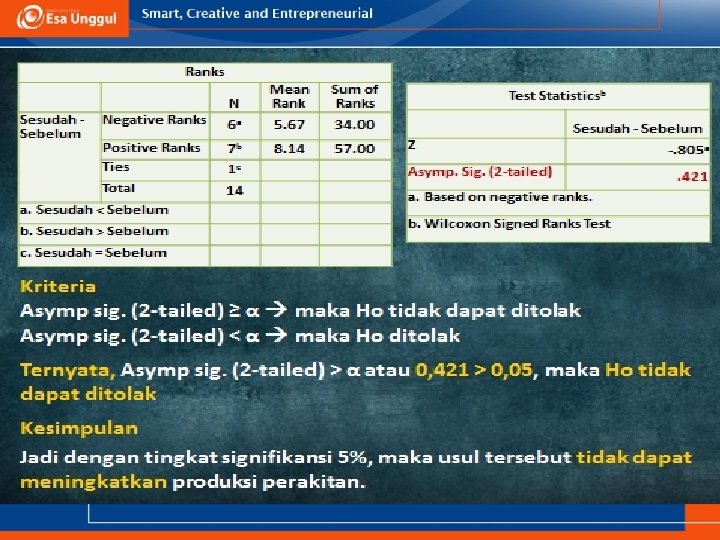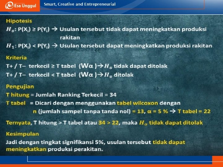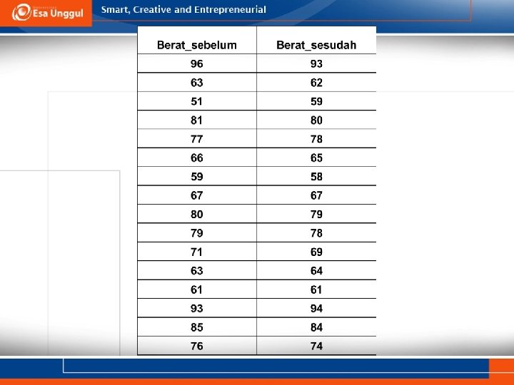 Interpretasi Hasil: Hasil perhitungan nilai “t” adalah sebesar 1, 714 dengan p-value (uji 2 arah). Sehingga dapat disimpulkan bahwa hasil hipotesis menerima Ho, sehingga dengan kata lain secara statistik “tidak ada perbedaan yang bermakna pada berat badan siswa 9 (nilai p=0. 121 lebih besar dari nilai alpha = 0, 05)” Note : Jika probabilitas > 0, 05, maka Ho diterima Jika probabilitas < 0, 05, maka Ho ditolak