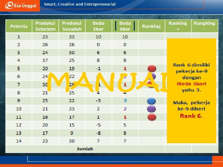 • Contoh : Untuk meneliti apakah obat penurun berat badan benar-benar bekerja. Dilakukan penelitian terhadap sukarelawan. Sebelum diberi obat, berat sukarelawan ditimbang. Kemudian selama satu minggu sukarelawan meminum obat penurun berat badan. Seminggu kemudian dilakukan pengukuran berat badan kembali dengan data yg ditampilkan sbb :