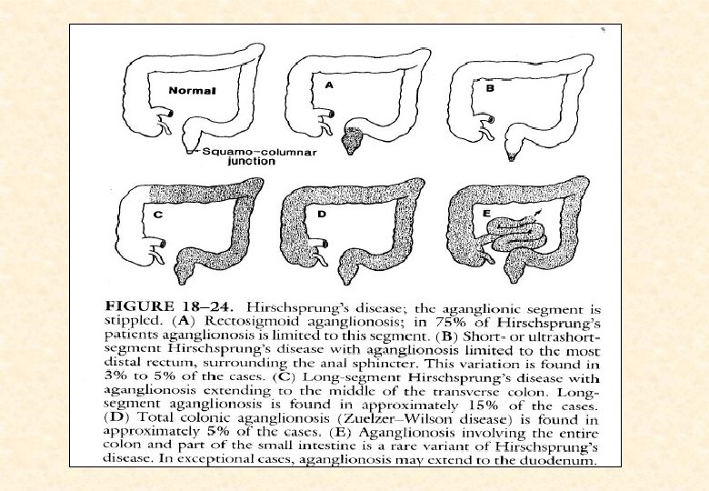 2. Aganglionosis seluruh kolon Ø Aganglionosis meliputi seluruh kolon tanpa atau dengan sebagian usus halus dg panjang tertentu, lebih serius jika disertai agonglionosis seluruh intestin. Ø Insidens 5 -8% dari populasi penyakit hirschsprung. Ø Kecenderungan aganglionosis seluruh kolon lahir dari keluarga dengan penyakit hirschsprung (12 -21%)