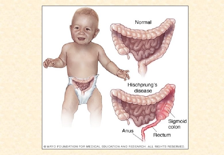 DEFINISI • Disebut juga kongenital aganglionik megakolon • Merupkan keadaan usus besar (kolon) yg tdk mempunyai persarafan (aganglionik). • Ada bagian usus besar (mulai dr anus keatas) tidak mempunyai persarafan terjadi kelumpuhan usus besar usus mjd membesar (megakolon)