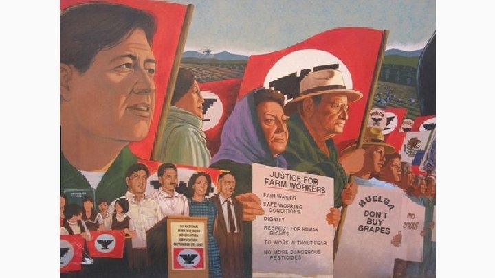 Cesar picked fruit all day and registered Mexican workers to vote at night. In 1962, he organized the United Farm Workers of America. ● When farm owners ignored their requests for better pay and safe working conditions, the union held a 5 year strike and nation- wide grape boycott. ● Strikers lost their jobs, were beaten, and even thrown in jail. ● Union members fasted and marched miles to make demands known to citizens. ● Grape growers lost millions of dollars as the boycott spread across America. ● Soon after the boycott lawmakers supported the farm worker union struggle and laws changed and working conditions improved. The UFW union keeps fighting for their rights today.