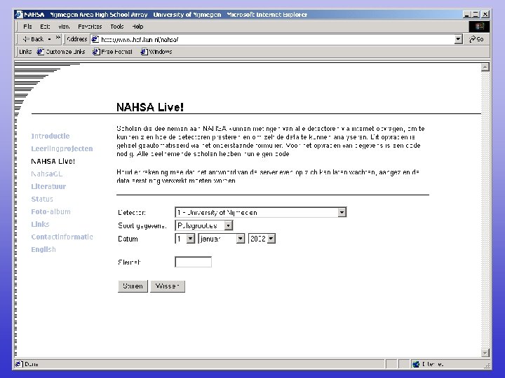 Mogelijke leerling projecten • Werking detectorstation (met hulp vanuit de universiteit) • Kosmische straling (literatuur onderzoek) • Het internet (literatuur/praktisch) • Tijd en positiebepaling: GPS (literatuur/praktisch)