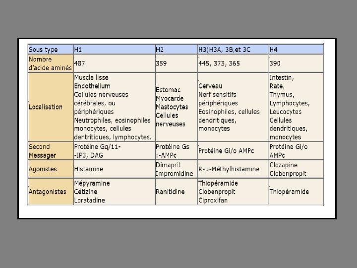 Effets et récepteurs 2 types de récepteurs histaminiques postsynaptiques: H 1 et H 2, des récepteurs H 3 présynaptiques, présents dans le cerveau et des récepteurs H 4 décrits plus récemment. Effets H 1: a) contraction des fibres lisses (bronchiques et digestives), par l’intermédiaire des protéines G qui activent la phospholipase C conduisant à une augmentation du Ca 2+ intracellulaire. b) une vasodilatation capillaire, par libération de monoxyde d’azote. c) par effet central, une augmentation de la vigilance: inhibition de cet effet stimulant par les anthistaminique H 1 qui traversent la barrière hémato-encéphalique.