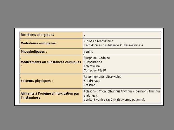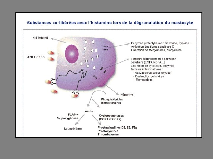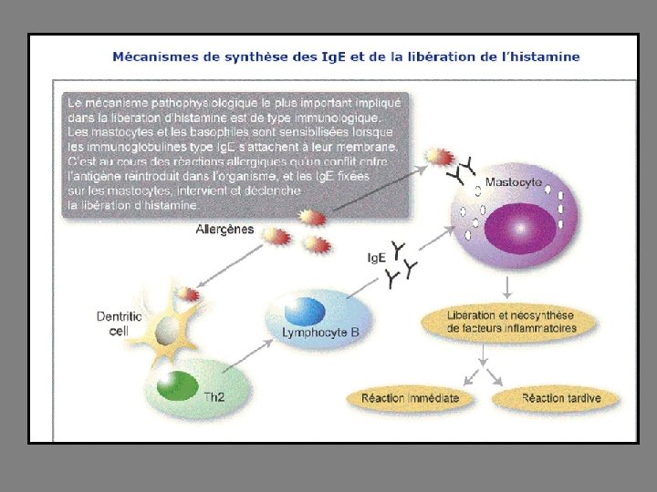 Libération dans l’organisme Allergie ou anaphylaxie: L’histamine est libérée lors de réactions antigène-anticorps à l’extérieur des mastocytes ou des basophiles et également sous l’influence de médicaments ou produits toxiques. Au niveau du système nerveux centrale: La régulation de la libération d’histamine au niveau des synapses du système nerveux central est mal connue, mais on sait que l’activation des récepteurs H 1 présynaptiques l’inhibe.