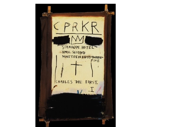 COURONNE: ROI, Association Charlie Parker (qu’il adore ) à un roi: lien avec Charles premier: roi décapité la couronne à trois pointes sera une marque récurrente de ses tableaux. PREE: un des enfants de Charlie mort à 2 ans THOR: super héros de bandes dessinées, il associe Charlie Parker a un super héros Cherokee: compo très connue de Charlie mais aussi à ses origines indiennes Logos « s » de superman Le mot HANDS barré: rappelle que la magie d’un saxophoniste réside dans ses mains, également présentes La plupart des jeunes roi vont voir leur tête coupées…Les génies ont la vie courte comme la sienne Admiration de la Callas: représenté par OPERA et des AAA