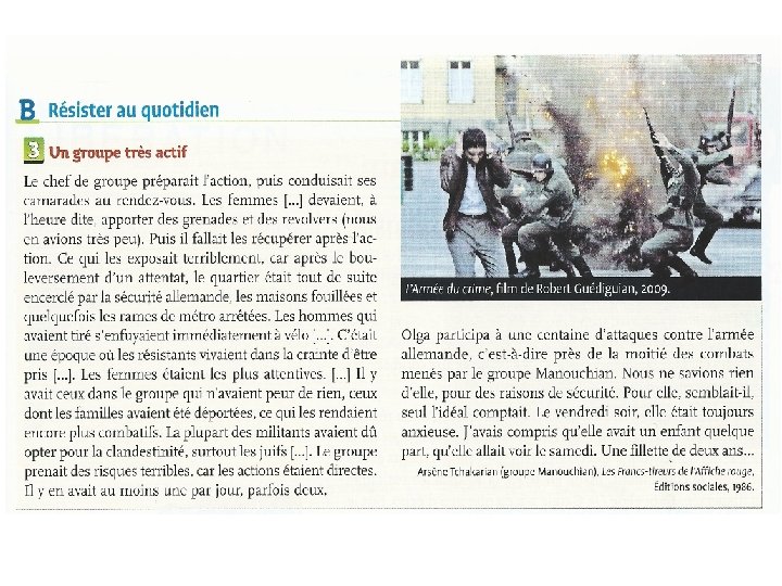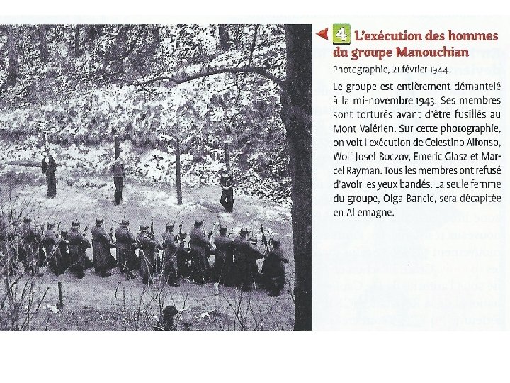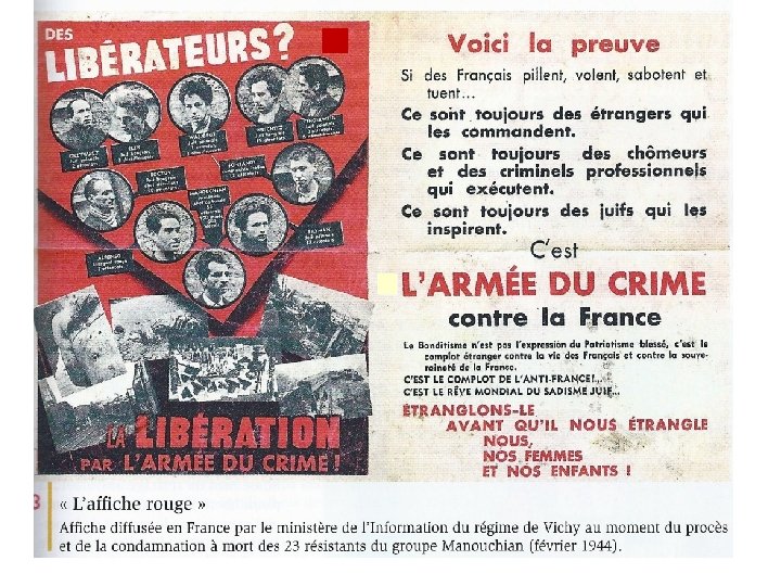4. Quelle impression donnent les photographies des résistants ? Ces photos, en médaillons, sont les portraits des « terroristes » qui ont des mines défaites, sinistres, cheveux en bataille de certains, de nature à effrayer, mais en réalité ils sont marqués par l’épuisement et les tortures. 5. Quel est le but des légendes qui les accompagnent ? Les légendes portraits mentionnent : -le nom (pas de prénom pour refuser l’aspect affectif) ; la nationalité (ce sont des étrangers), - 7 d’entre eux sont juifs, pour 2 d’entre eux on mentionne que ce sont des communistes (Espagnol « rouge » , communiste italien). - On fait la liste des faits dont ils sont coupables (attentats, déraillements). -Un sort particulier est réservé à Manouchian « chef de bande » (comme un vulgaire criminel) qui est le seul pour lequel on donne le nombre de morts et de blessés (150 morts, 600 blessés).