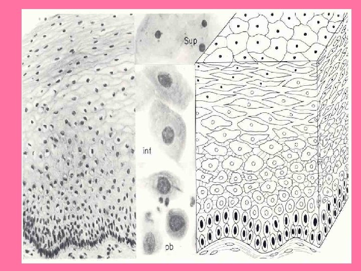 • CELULAS MÁS PROFUNDAS: BASALES • CELULAS PARABASALES • CELULAS INTERMEDIAS • CELULAS SUPERFICIALES. • CARACTERISTICAS MORFOLÓGICAS PROPIAS, HAY QUE OBSERVAR SU NÚCLEO Y SU CITOPLASMA.