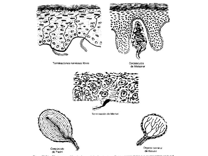 NERVIOS • Hay dos categorías de terminaciones de nervios sensoriales: – Terminaciones libres: • Carecen de especializaciones receptoras morfológicamente reconocibles en sus extremos. Las más comunes están en la epidermis y acaban en terminaciones ciegas en el estrato granuloso. • Pueden ser receptores de dolor o termorreceptores. • Otros nervios aferentes mielinizados forman los complejos células de Merkel-neurita. – Terminaciones nerviosas encapsuladas: • • Corpúsculos de Pacini Corpúsculos de Meissner Bulbos terminales de Kraus Corpúsculos de Rufini.