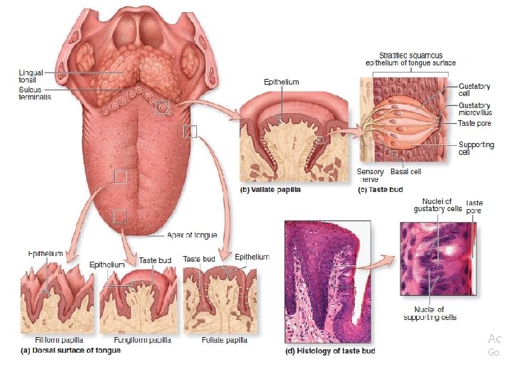 • Sel sensoris & penyokong sel-sel torak dgn mikrovili • 4 jenis taste buds • rasa manis bgn depan lidah • rasa asin bgn tengah lidah • rasa asam bgn tengah lidah • rasa pahit bgn belakang lidah