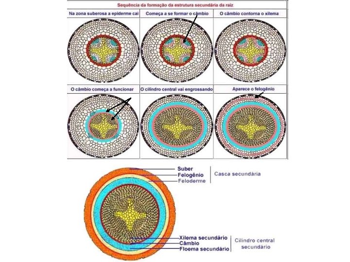 Estrutura secundária da raiz • Raízes eudicotiledôneas podem apresentar crescimento secundário; • Câmbio vascular no cilindro central forma xilema e floema secundários • Felogênio (câmbio da casca) forma periderme