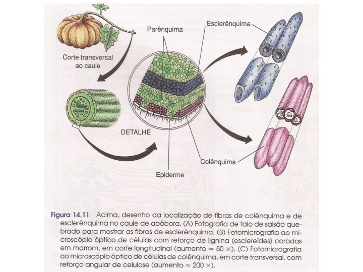 – Esclerênquima • Sustentação, células mortas, PC espessadas, com lignina; – Esclereides – Fibras – Colênquima • Sustentação, células vivas, PC espessadas de forma desigual, ricas em celulose, pectina e outras substâncias. Não contém lignina • Sob a epiderme dos caules jovens em crescimento ou margeando as nervuras das folhas das eudicotiledôneas