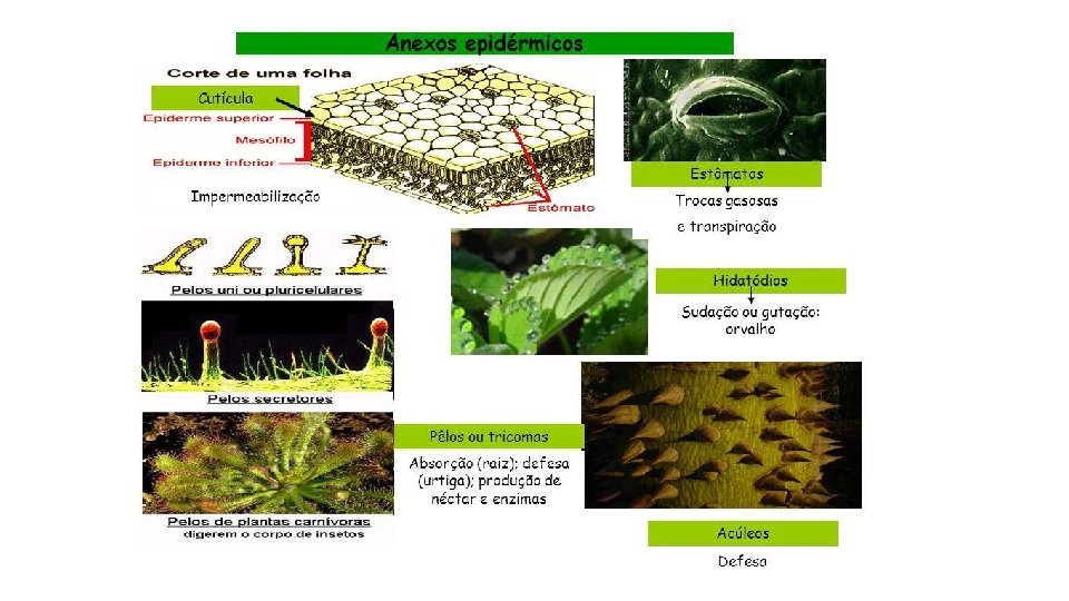 Tecidos de proteção ou revestimento Epiderme • Formado por células vivas e justapostas, geralmente com apenas uma camada celular • Envolve raízes, caules, folhas, flores, frutos e sementes • Promove a defesa da planta contra a ação de parasitas e contra a perda excessiva de água para o meio externo • Anexos: cutícula, acúleos, pelos e estômatos