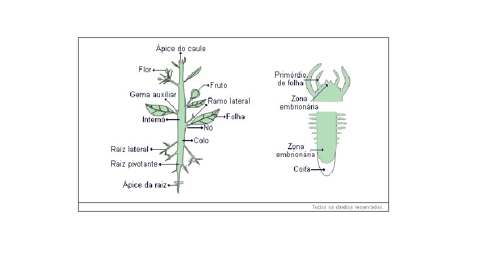Meristemas primários • Originam-se das células do embrião • Localizam-se no ápice e ao longo do caule, definindo, as gemas apicais e laterais • Na raiz, encontram-se envolvidos pela coifa (estrutura de proteção) • Gemas laterais surgem depois da apical e são responsáveis pela formação de ramos, folhas e flores • Promovem crescimento em extensão (longitudinal)