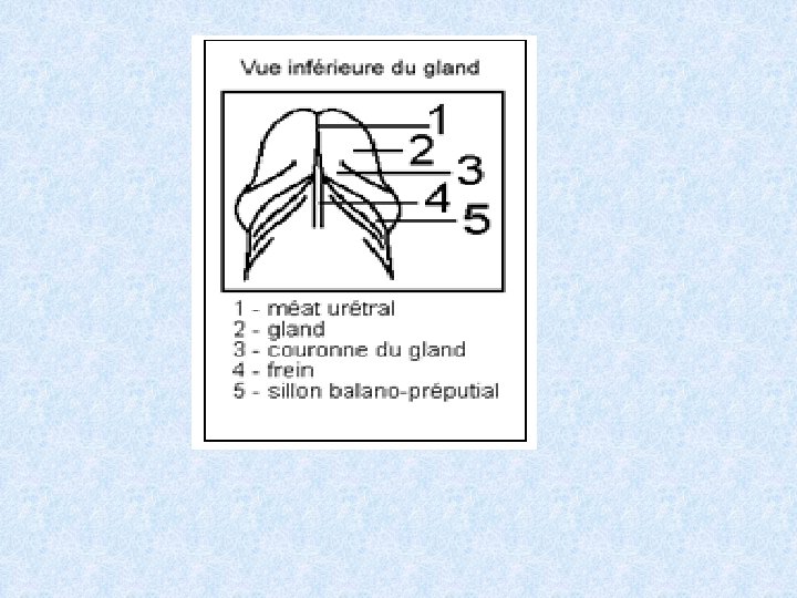 3 - deux glandes endocrines : La prostate Les vésicules séminales 4 - Le pénis organe de la copulation comportant une paire de petites glandes accessoires ; les glandes de Cowper