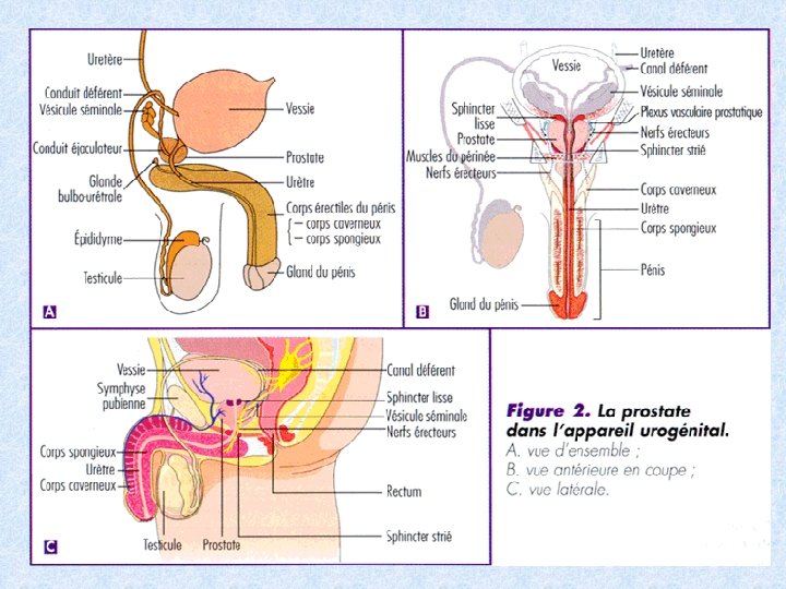 Les glandes annexes A. La prostate glande exocrine entourant la partie initiale de l’urètre avec deux parties : caudale et crâniale. Histologie: capsule périphérique conjonctive parenchyme lobulé par des cloisons conjonctives lobules faits de glandes tubulo-alvéolaires en trois régions : interne ; glandes de la muqueuse intermédiaire; GL de la S/muqueuse périphérique; GL principale + +++