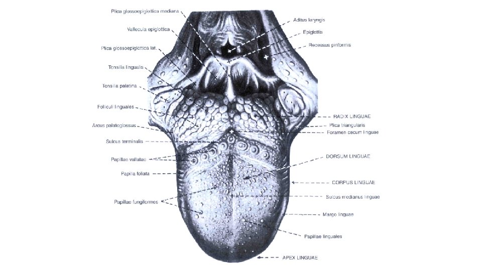 Zunge Radix linguae PARS FOLLICULARIS Sulcus terminalis Corpus linguae Dorsum linguae Apex linguae PARS PAPILLARIS