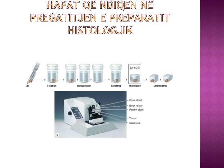 � Shpëlarja me ujë, � Dehidratimi ose largimi i ujit me anë të lëndëve dehidratuese si alkole(etilik, butirik) dhe lëndë të tjera kimike � Ngurtësimi i materialit dhe vendosja në blloqe prej dërrase (rrëshirë plastike ose parafinë) duke e futuar paraprakisht në një medium(ethanol) ose (benzol)që tret parafinën, dhe pastaj materialin e ngopur me benzol e fusim në parafinë të shkrirë � Prerja e materialit kryhet me anë të mikrotomit ose ultramikrotomit � Ngjyrimi i prerjeve � Mbulimi i prerjes