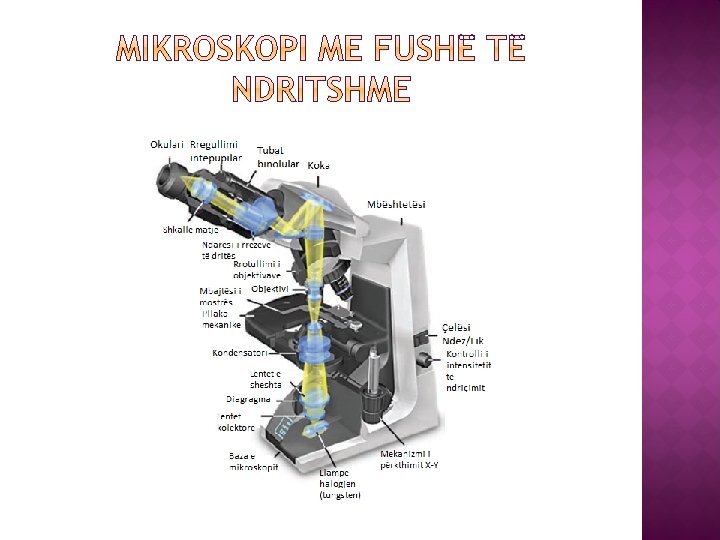 � Mikroskopi me fazë kontrasti ose kontrasti faze � Përdoret për studimin e preparatëve të pasqyruara ose qeliza të gjalla, siç janë ato të përgatitura me anë të kulturës në xham. Strukturat brenda qelizore nuk mund të shikohen në mikroskopin optik për arsye se këto struktura kanë pothuajse të njëjtin indeks të thyerjes së dritës me atë të citoplazmës. � Mikroskopi me fluoreshencë. � Si burim drite ky tip mikroskopi ka rrezet ultraviolet. Me anën e tij shikohen objekte që kanë fluoreshencë natyrore si p. sh. , fijet kolagjene, fijet elastike, indi kërcor, vitaminat A 1, B 2, të cilat marrin një shkëlqim të veçantë. � Mikroskopi me fushë të errët � Ky tip mikroskopi punon me burim të fuqishëm drite me drejtim të pjerrët në mënyrë të tillë që drita të mos hyjë në lenten e objektivit. Kështu fusha e shikimit mbetet në sfond të errët, objektivi që duam të shikojmë reflekton pak dritë, që në kushtet e fushës së errët bëhen të dukshme. Në këtë mënyrë, bëhet e mundur shikimi i grimcave shumë të vogla që nuk mund të shikohen me mikroskopin optik.